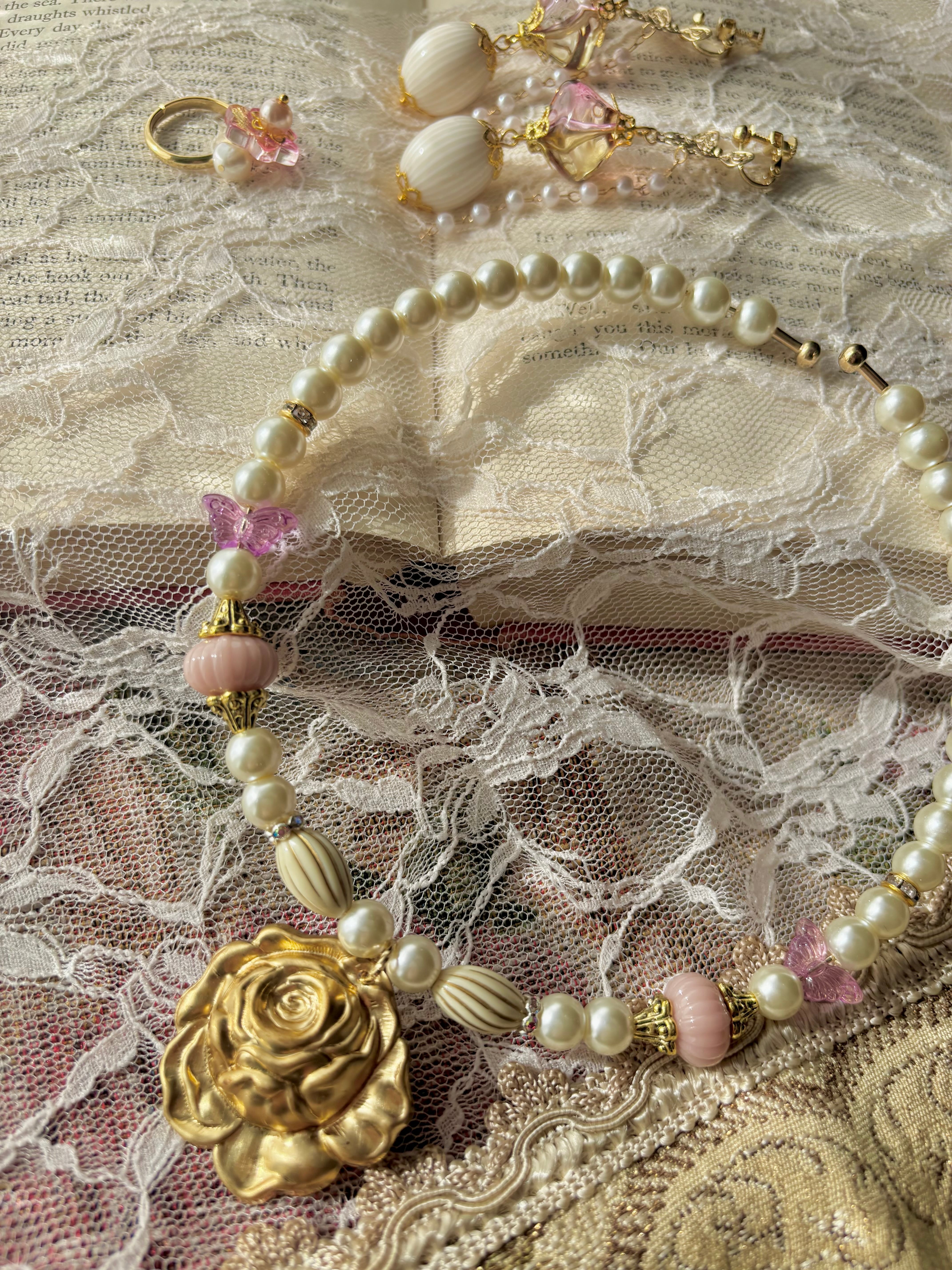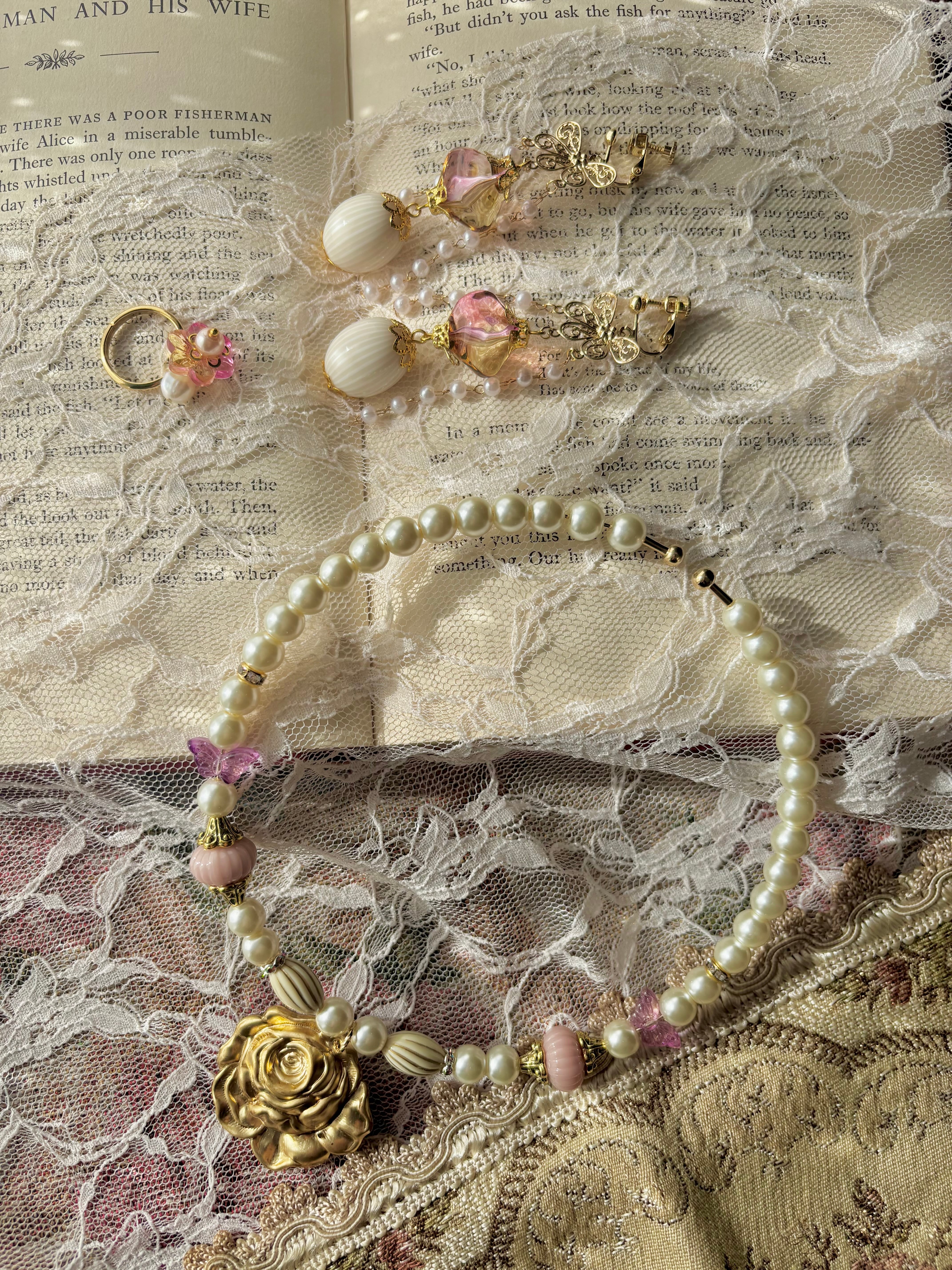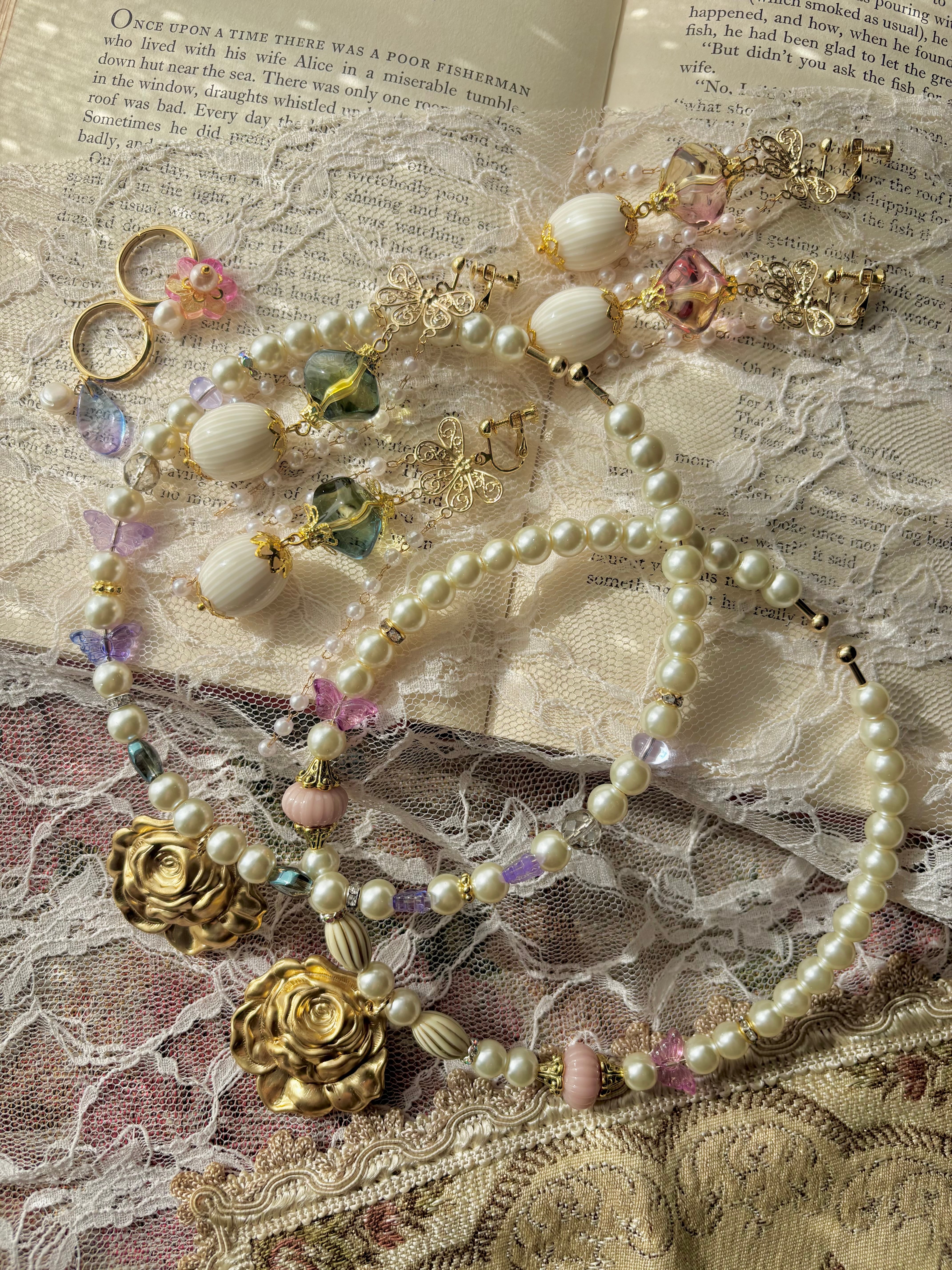 妖精女王「ティターニア」をイメージしたワイヤーネックレス、耳飾り、ゆびわのセットになります。