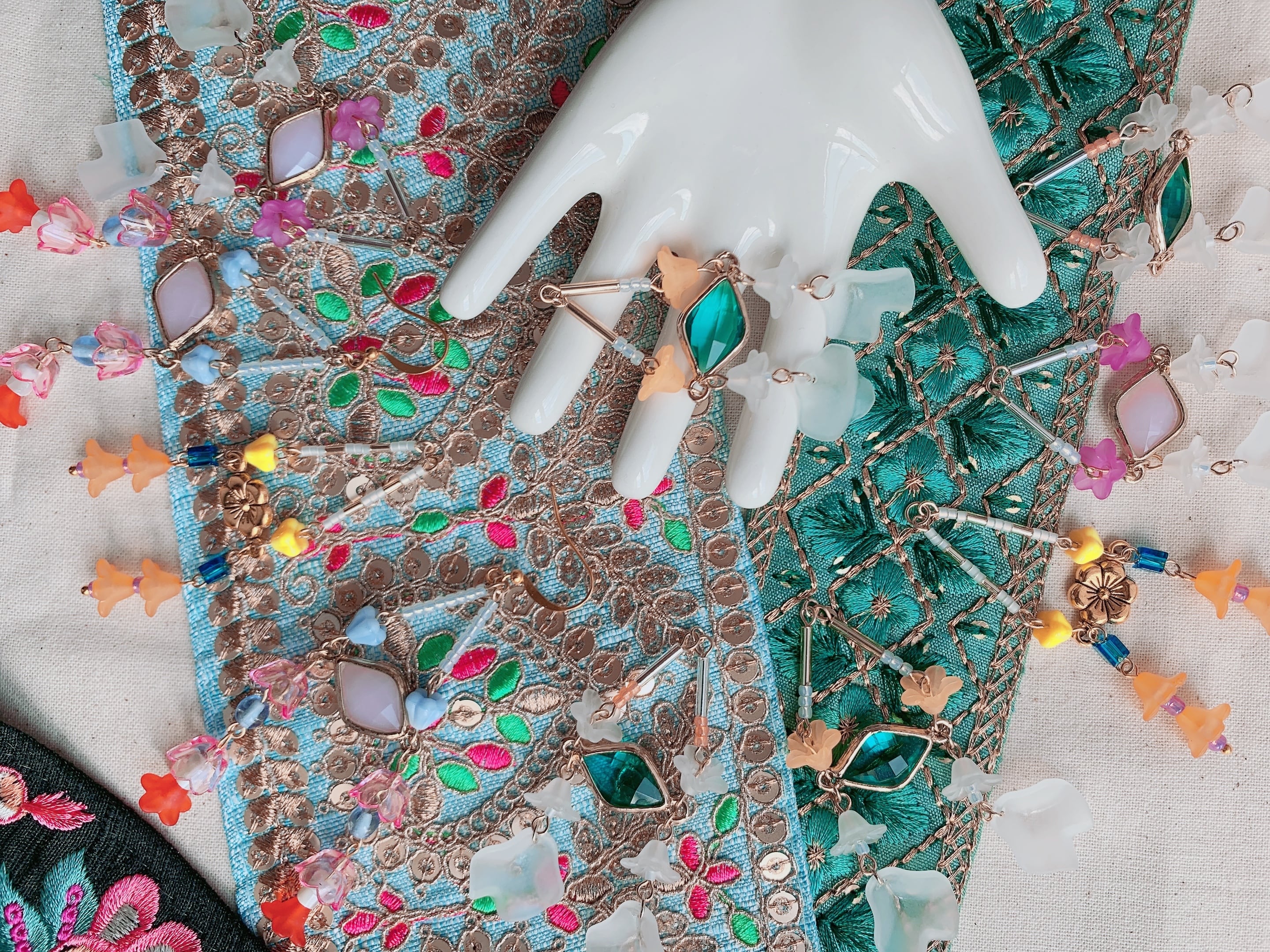 透明感のあるお花やガラスパーツがしゃらしゃら揺れるみみかざりです。