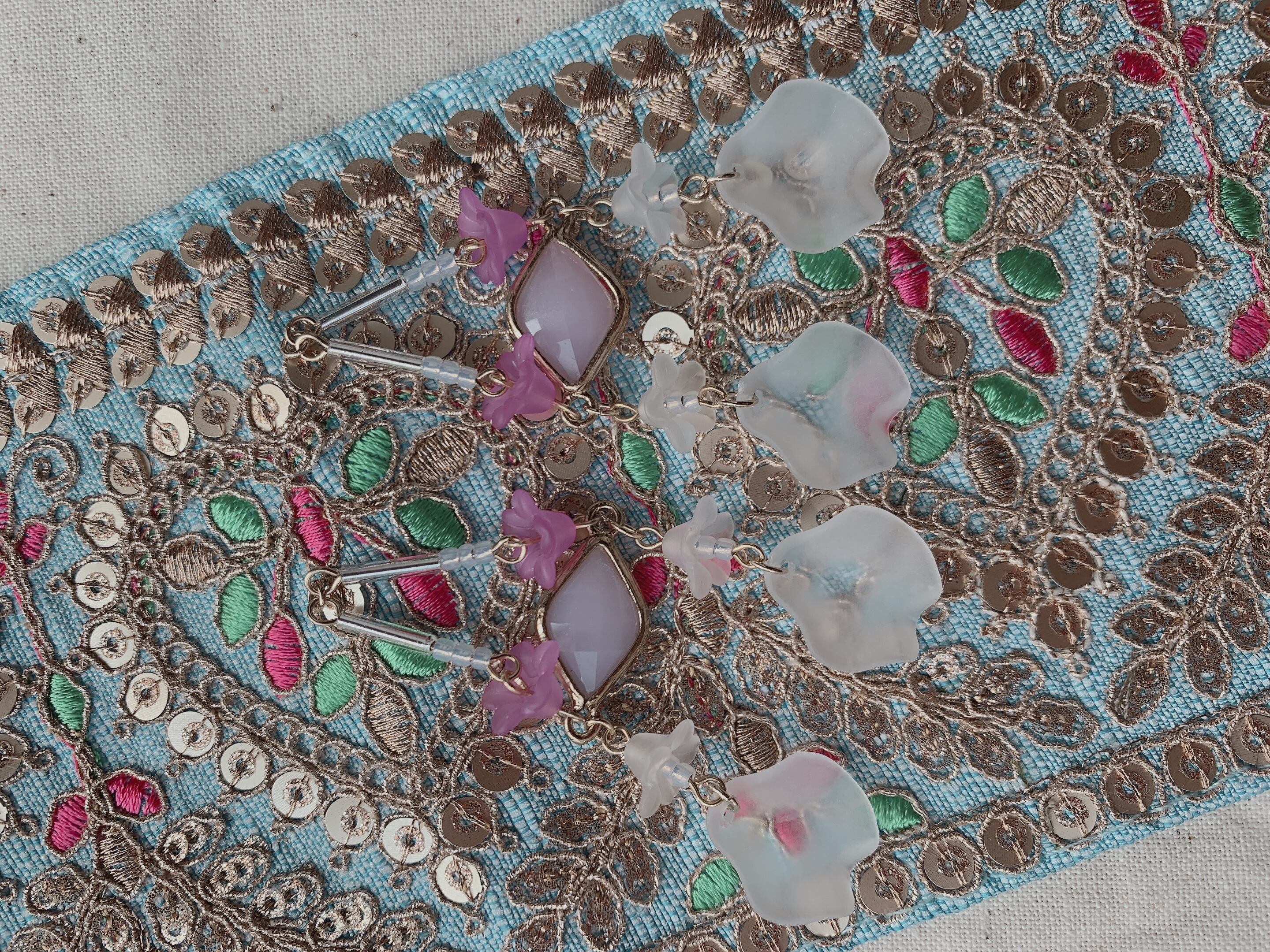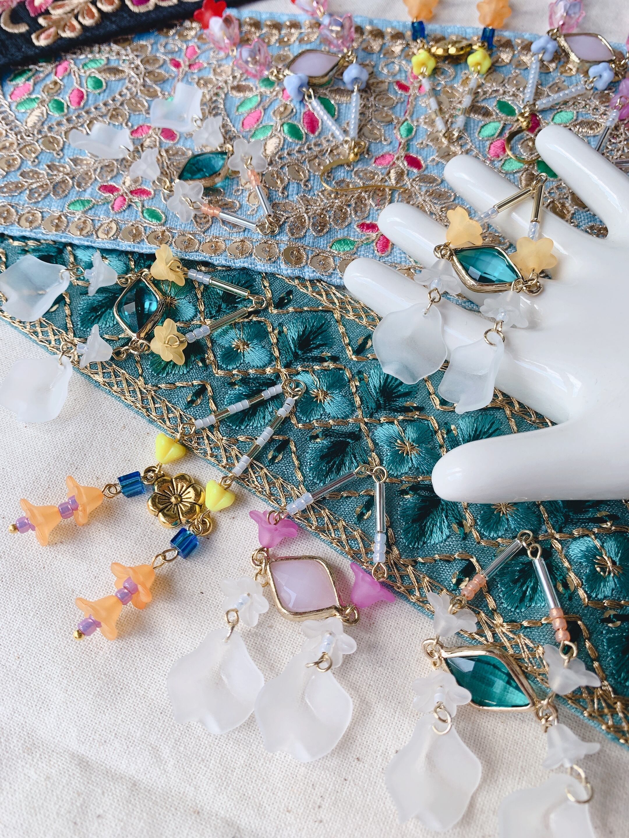 透明感のあるお花やガラスパーツがしゃらしゃら揺れるみみかざりです。