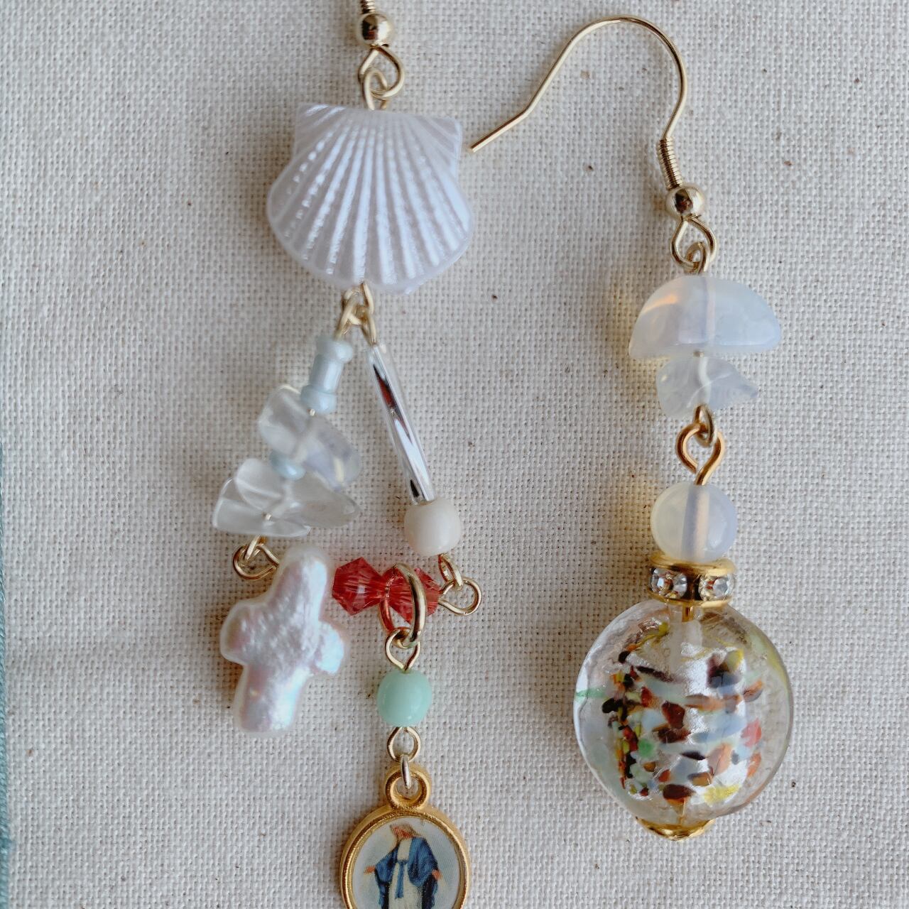 大きなガラスビーズ、シンセティックオパールを使用しているため少し重ためかもしれません。