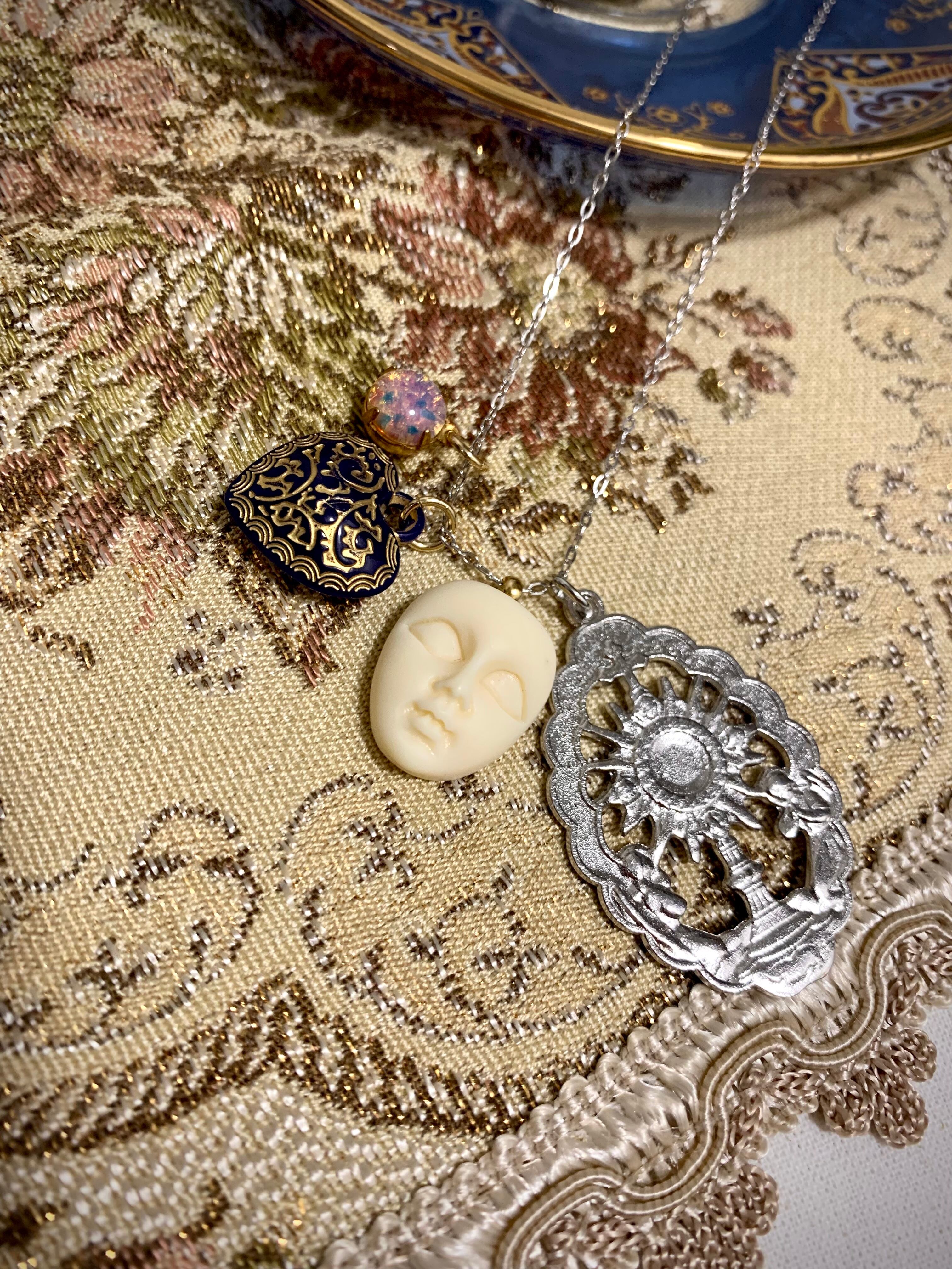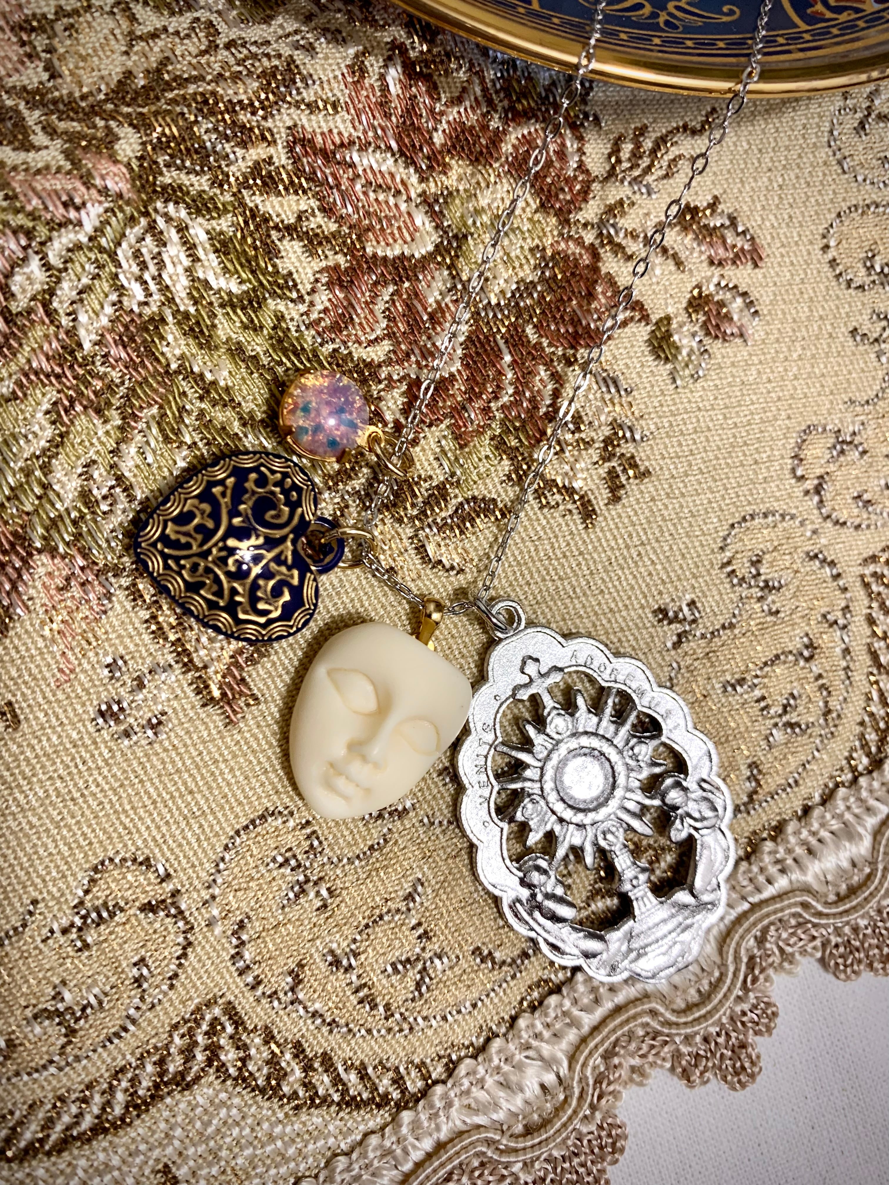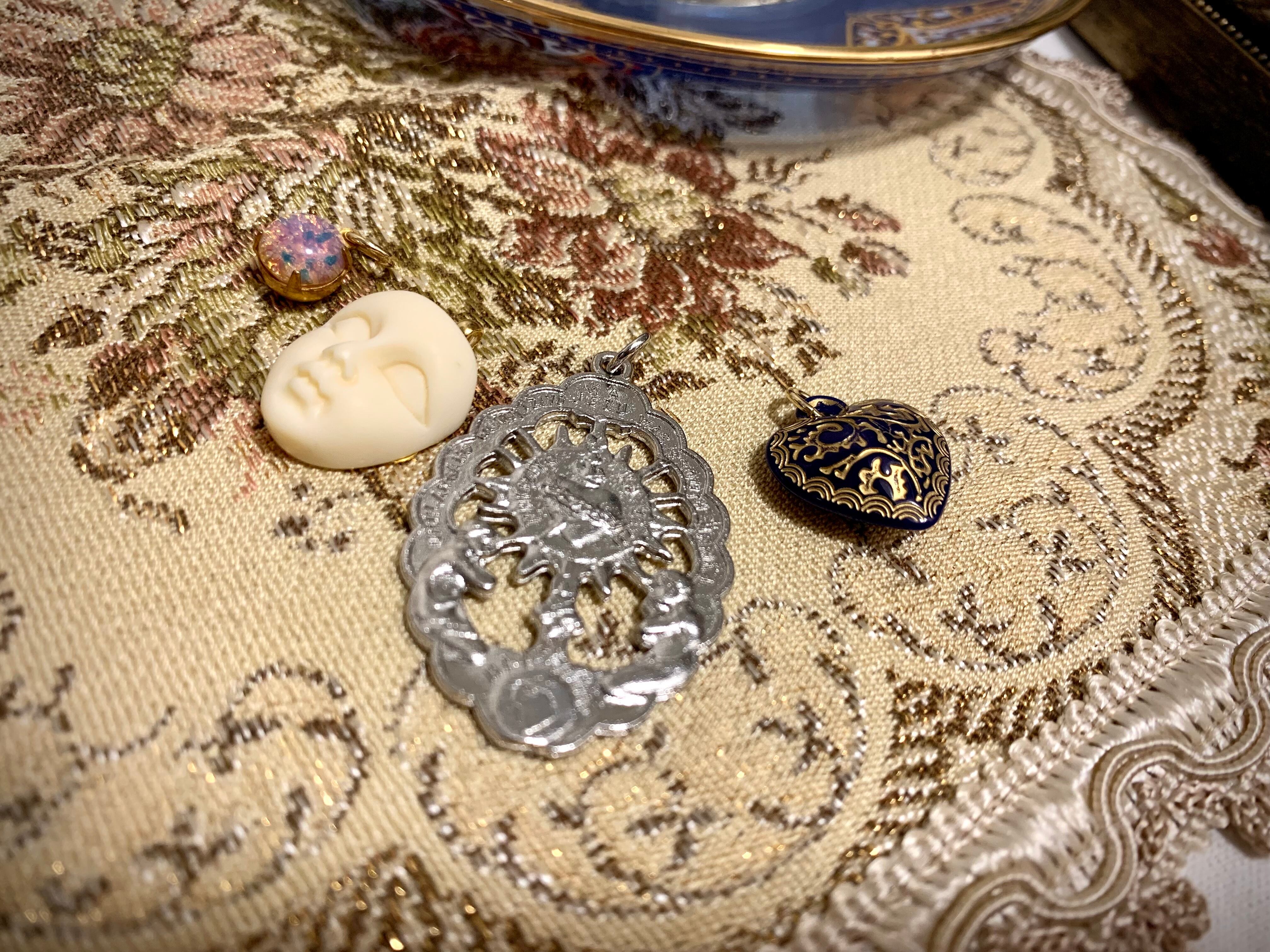 宗教モチーフやアンティークの風合いのあるカボション等を使用した、ネックレストップ4つのセットになります。