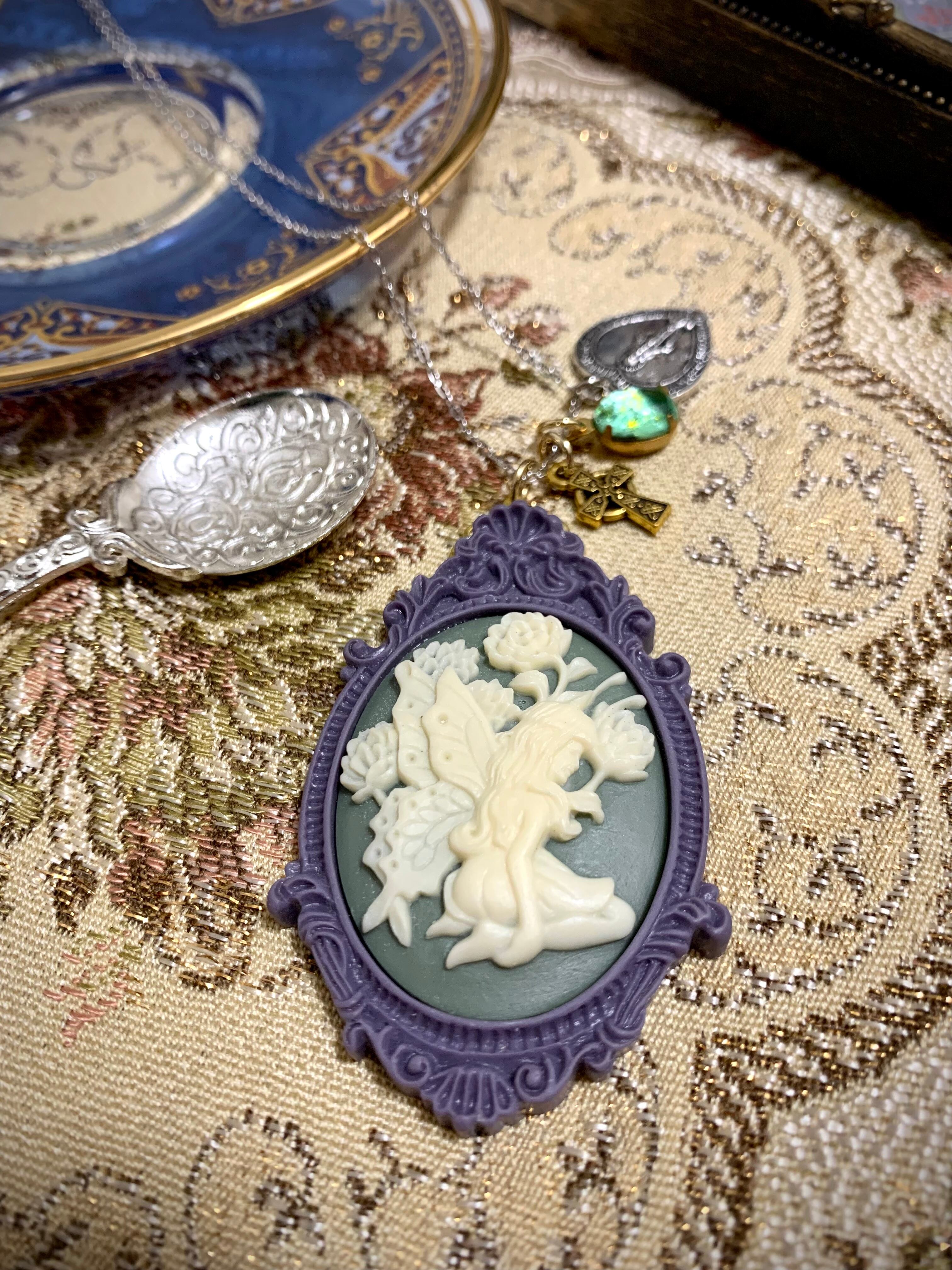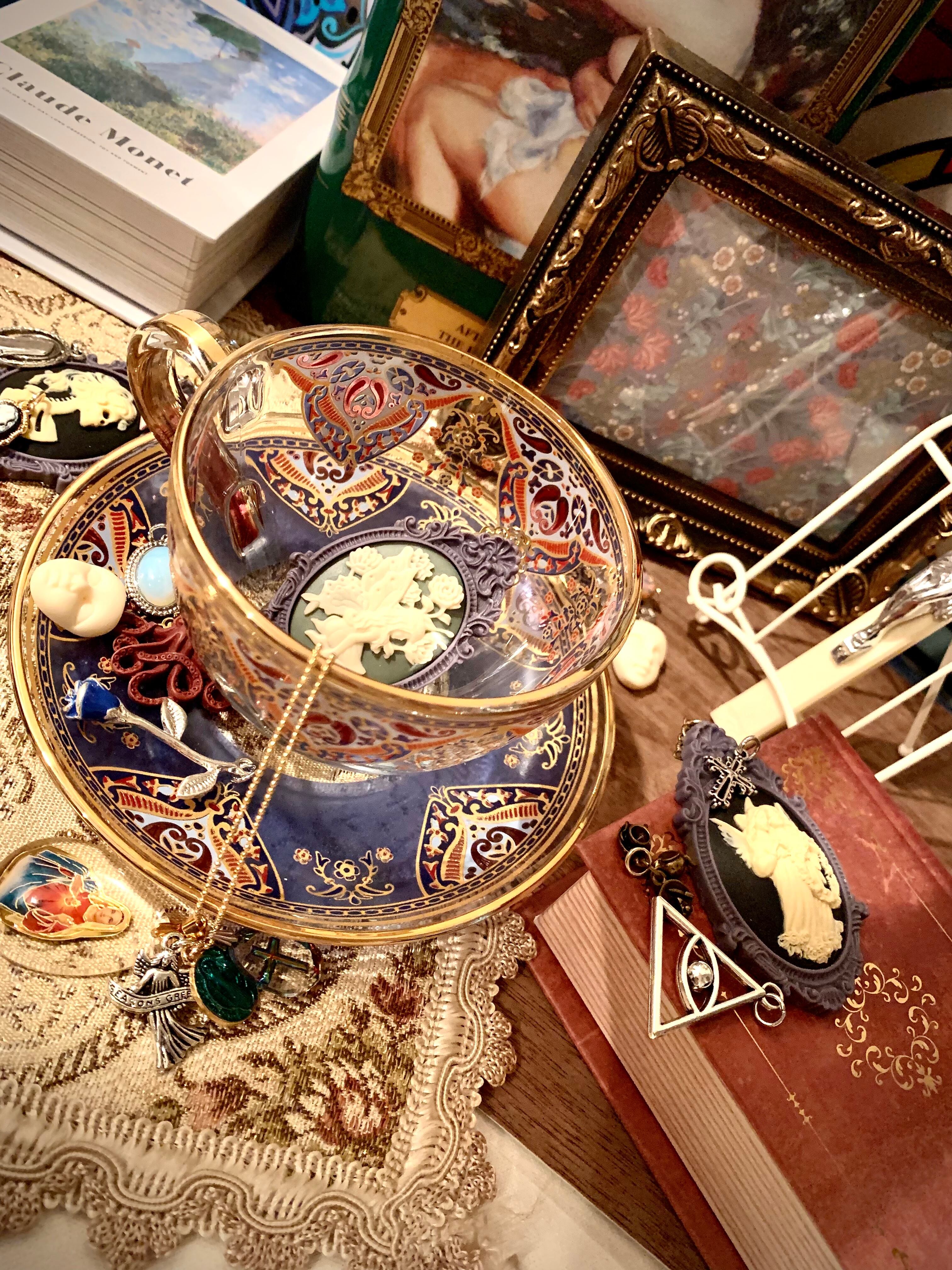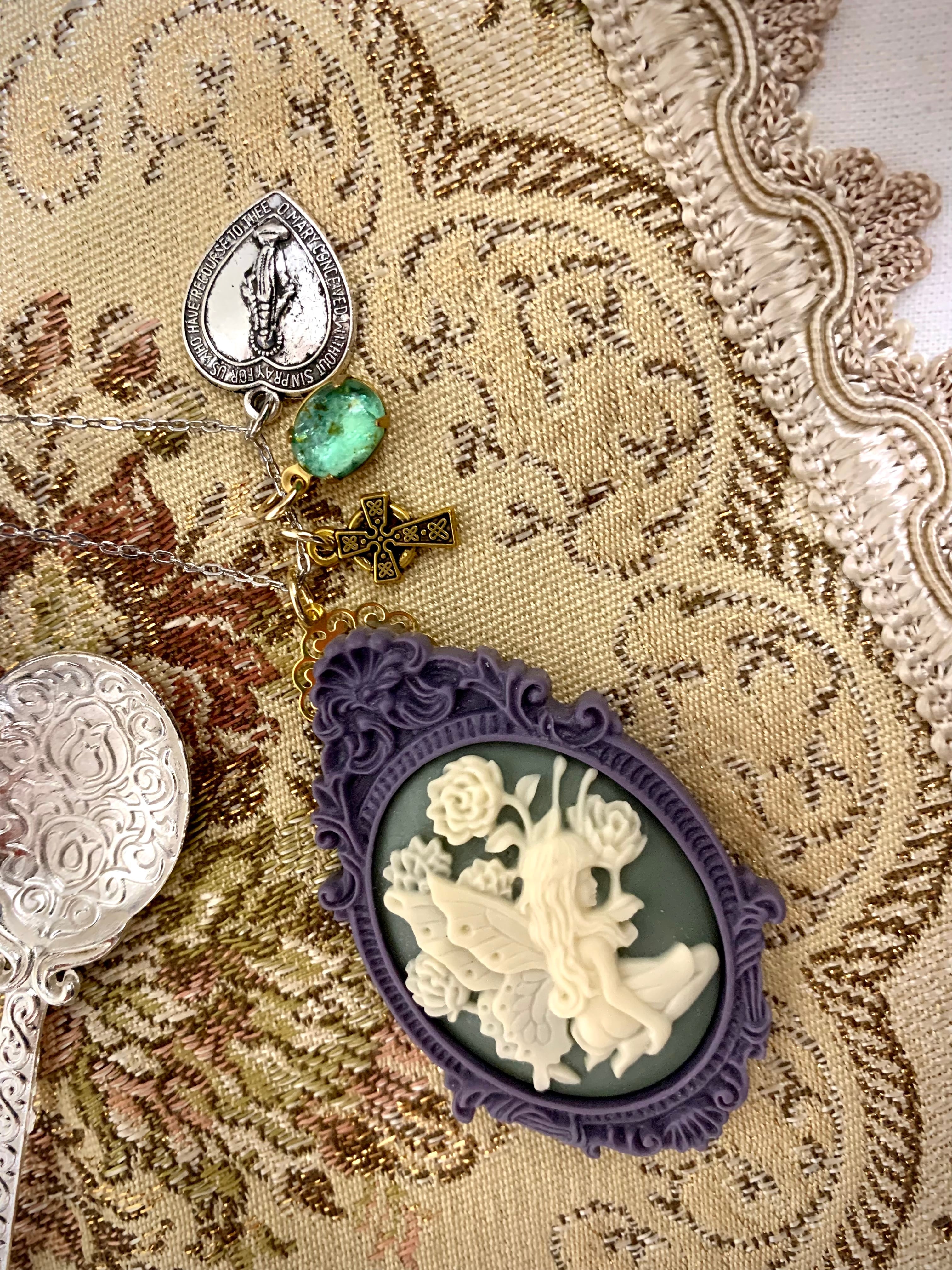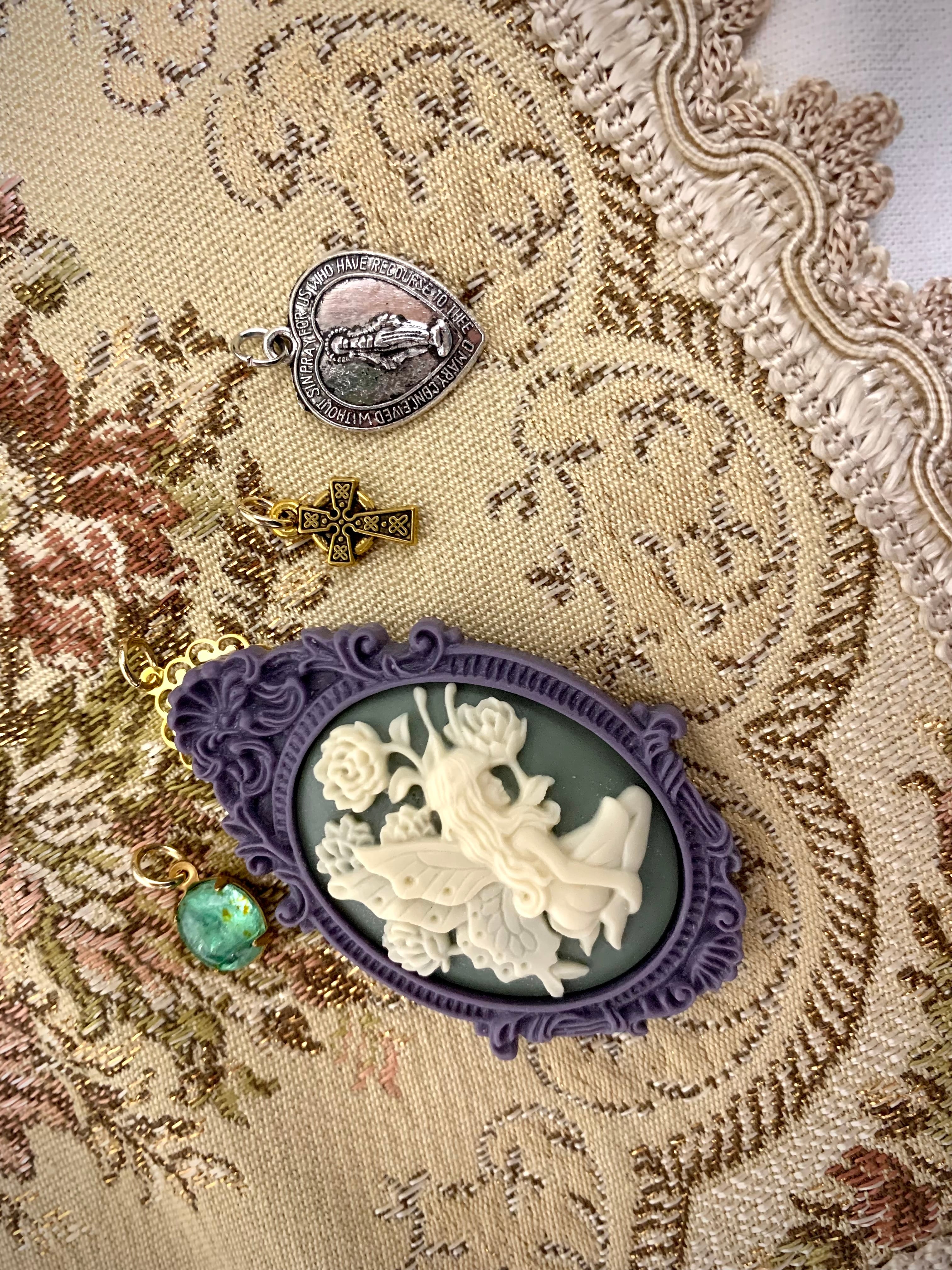 宗教モチーフやアンティークの風合いのあるカボション等を使用した、ネックレストップ4つのセットになります。